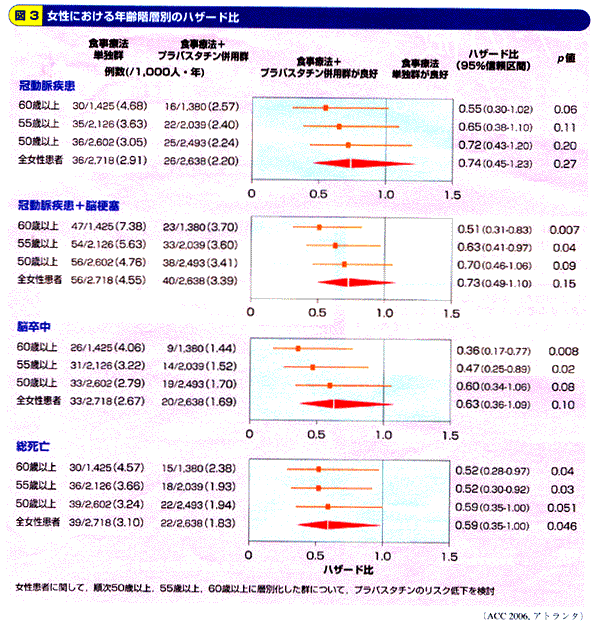 | 【女性に限ったサブ解析結果】 冠動脈疾患+脳梗塞は、ハザード比0.73(p=0.15) 脳卒中は、ハザード比0.63(p=0.10) 総死亡は、ハザード比0.59(p=0.046) 【結果の解釈とコメント】 「主要評価項目である冠動脈疾患、冠動脈疾患+脳梗塞、脳卒中のいずれにおいても、男性と同様に食事療法単独群にくらべてメバロチン併用群では発症抑制がみられた。女性では、発症頻度が低いため有意差が得られにくく、ハザード比を検討する事が重要と考えられる。」(日本医科大学千葉北総合病院内科教授 水野杏一氏) |